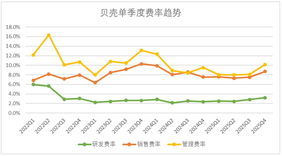 四季度贝壳的销售费用、管理费用及研发费用分别录得19.3亿、22.5亿及7.2亿元,费率分别达到了8.7%、10.2%及3.2%。