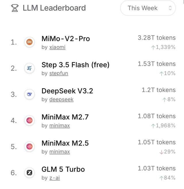 小米也凭借MiMo-V2-Pro的出色表现,与智谱、MiniMax、阶跃星辰、DeepSeek等一众国产大模型厂商包揽周榜前六名。
