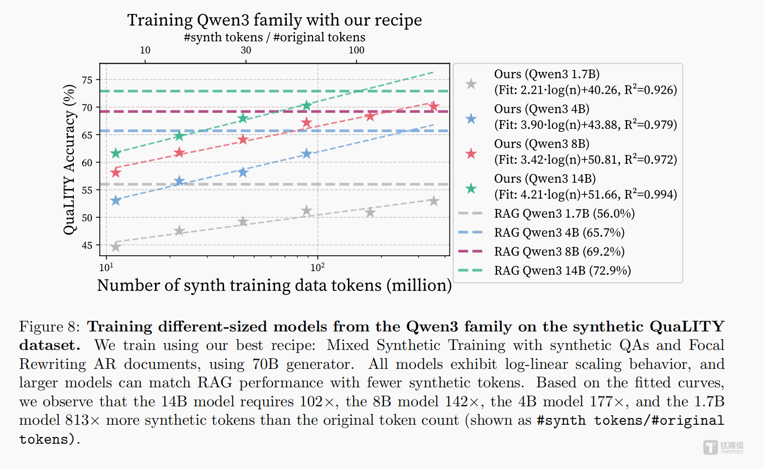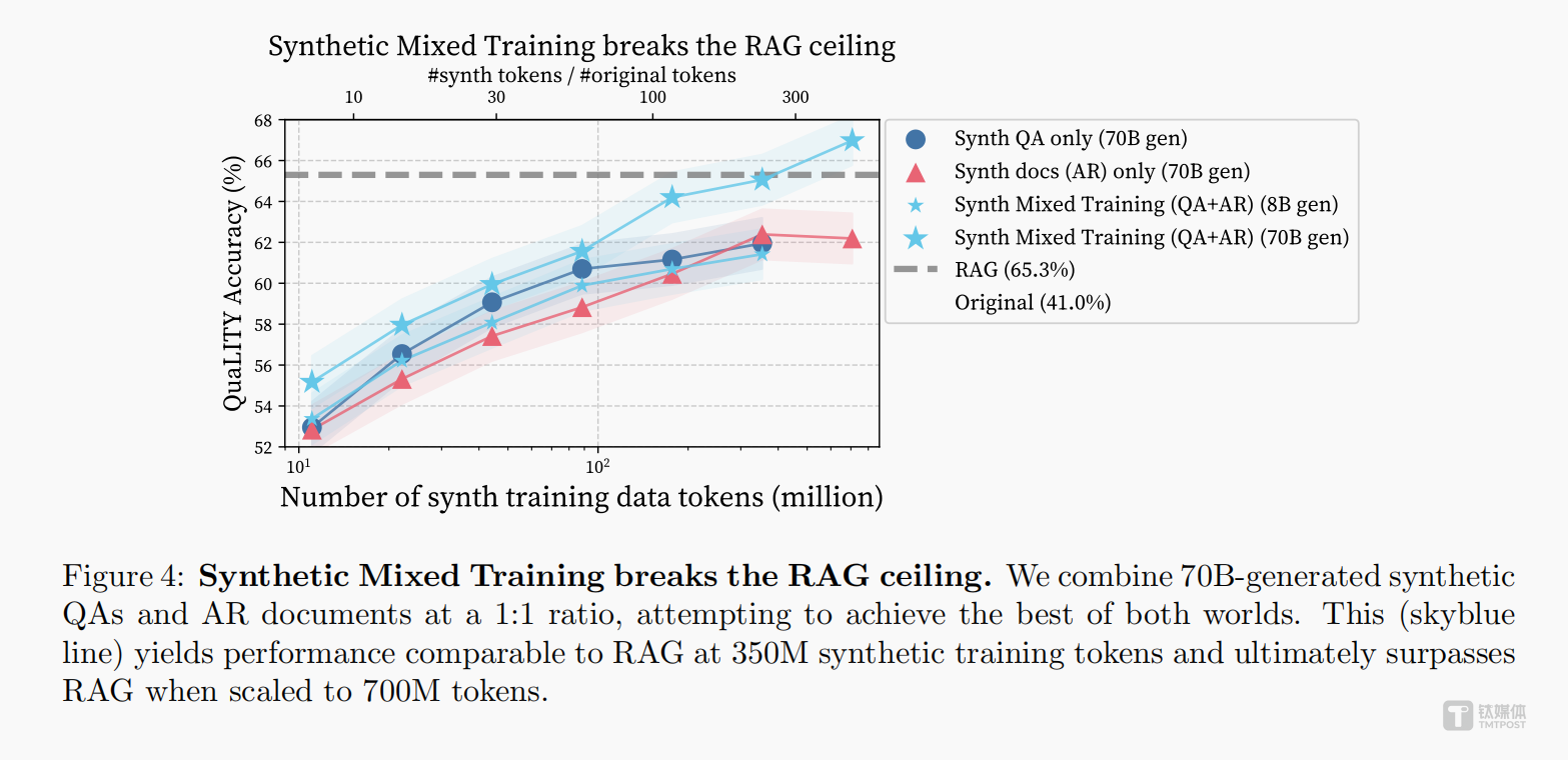 这支顶尖团队最初也遭遇了同样的瓶颈。在多轮测试中,单纯使用合成问答对、或是仅用合成文档训练模型,性能提升都极为缓慢,即便加大数据投放量,效果也会快速触顶,甚至比成熟RAG方案低4.6%。