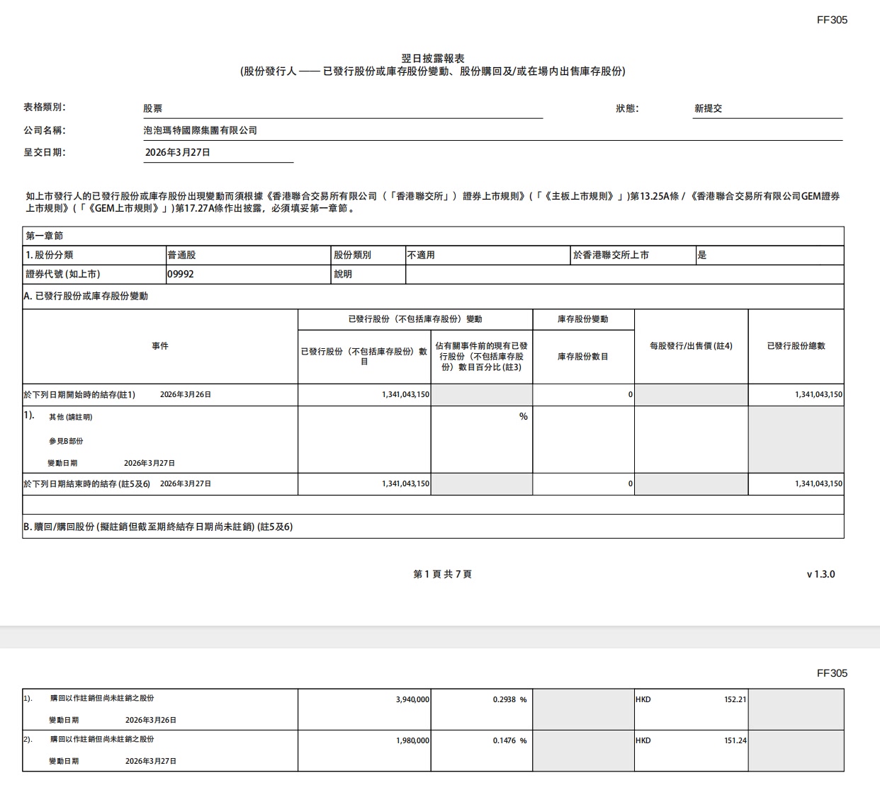 3月27日,泡泡玛特发布公告称将斥资2.99亿港元继续回购198万股股份,每股回购价区间为149.4至153港元,截至当日收盘,泡泡玛特每股报价149.6港元。就在前一日,泡泡玛特表示拟斥资约6亿港元回购394万股股份,回购价格148.4至1157.8港元。今年,泡泡玛特累计回购金额超12亿港元。
