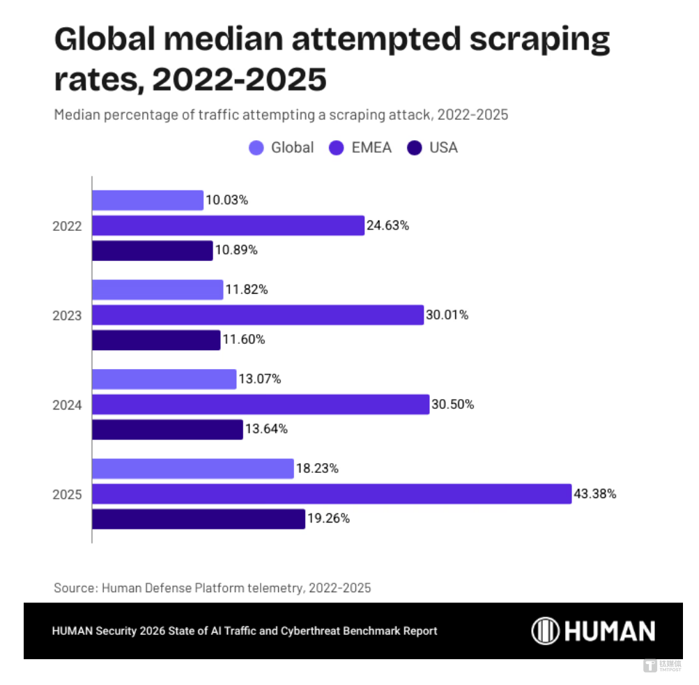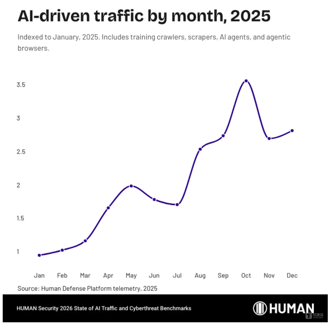 当地时间2026年3月26日,网络安全公司HUMAN Security发布年度报告《AI 流量与网络威胁基准状态》(The 2026 State of AI Traffic & Cyberthreat Benchmark Report)。