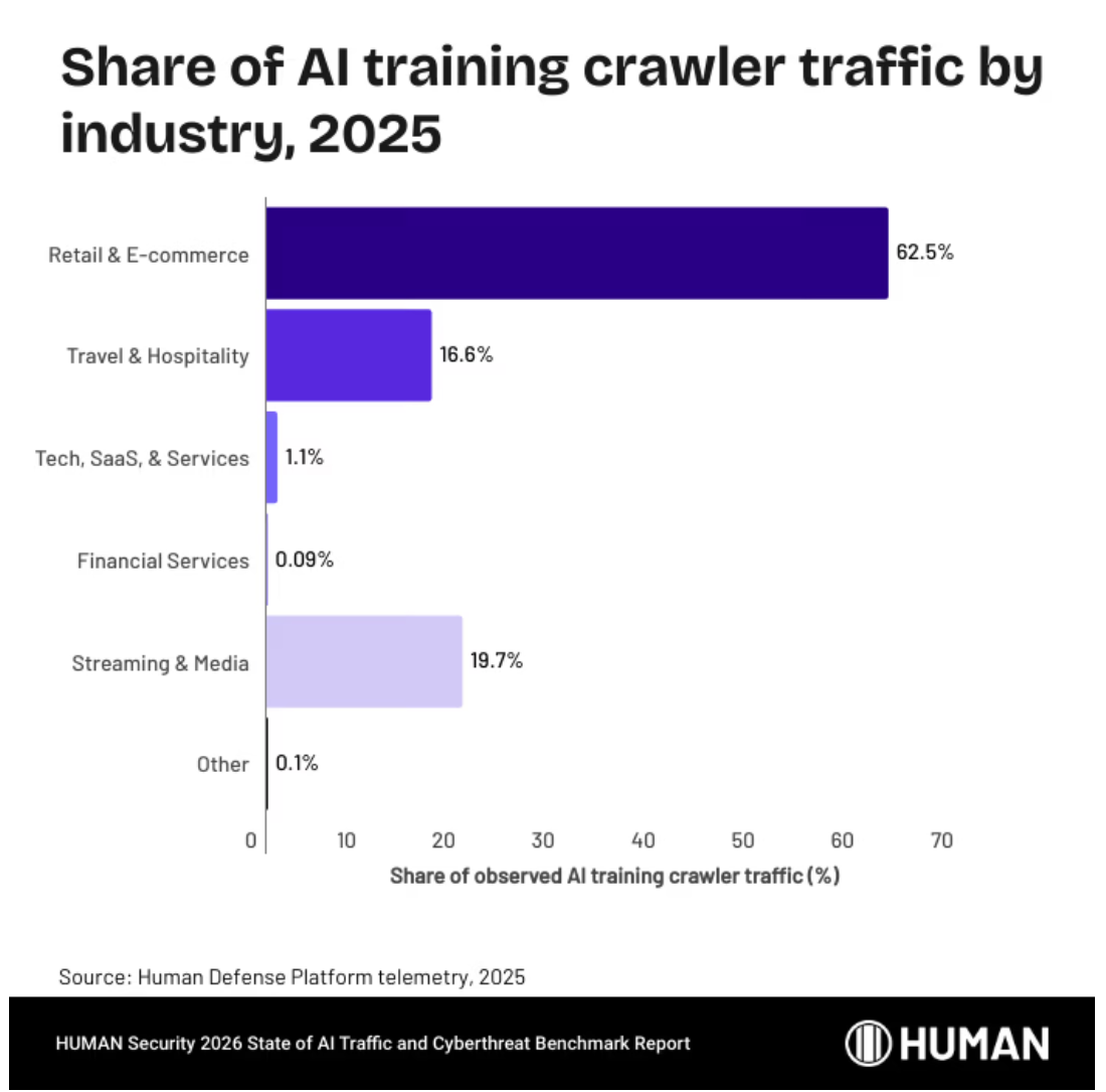 其中零售与电商更是AI训练爬虫流量的核心承载行业,成为机器流量渗透的主要领域,62.5%的AI训练爬虫流量均指向该行业,成为机器流量布局的核心阵地。