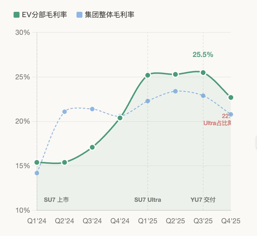 智能电动汽车的ASP(平均售价)也在上升,从2024年Q4的约23.4万元涨至2025年Q4的约25万元,增幅6.6%,主要因为交付了更高客单价的YU7系列。