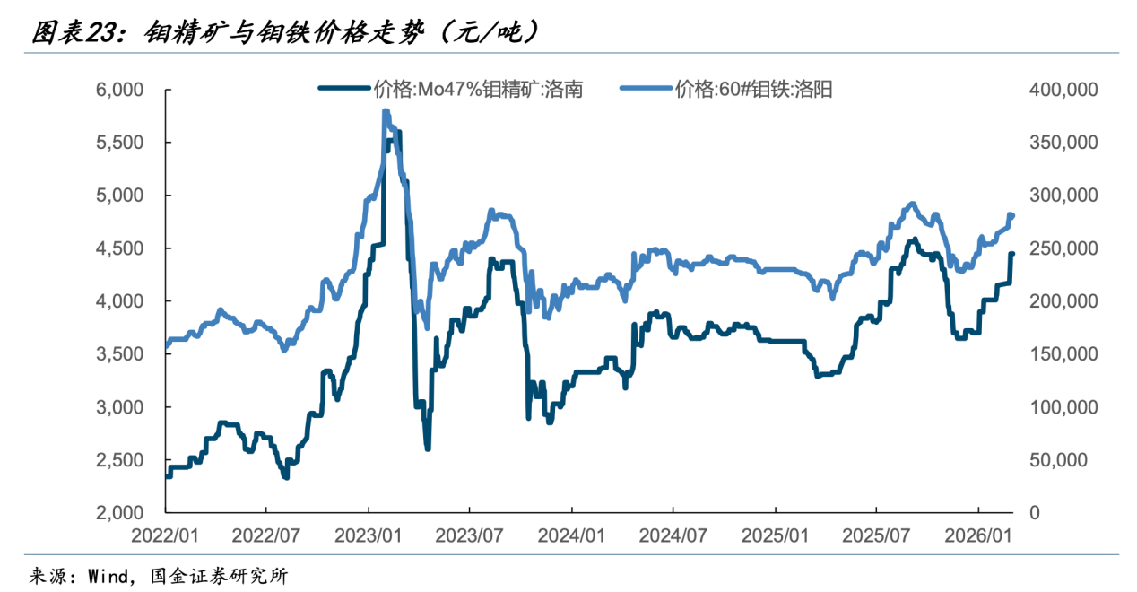 在此背景下,公司通过产能扩张锁定资源红利,同时谋划布局深加工领域,未来有望从“钼精矿+钼铁”的基础产品结构向钼产业链上的高精尖制品延伸,打开价值增长天花板。