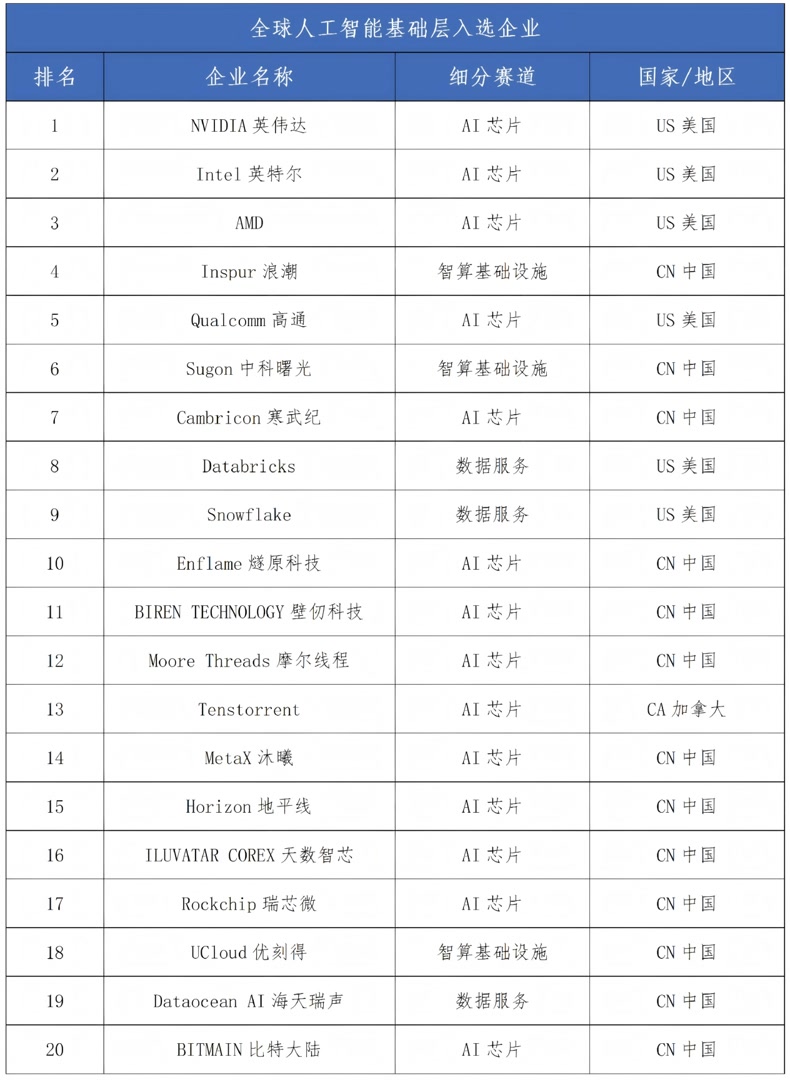 具体来看,基础层作为人工智能产业的核心底座,本次入选了英伟达、英特尔、AMD、浪潮、高通、中科曙光、寒武纪等20家企业,中国在企业数量上占据优势,但全球化体系仍有较大提升空间。