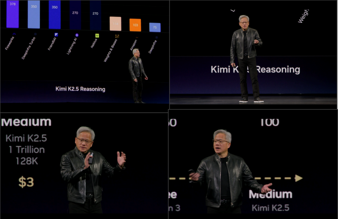 3月17号,Kimi 模型继年初的 CES 2026 之后,在黄仁勋的 GTC 2026 主旨演讲中再度成为英伟达展示下一代芯片和推理性能的御用模型。