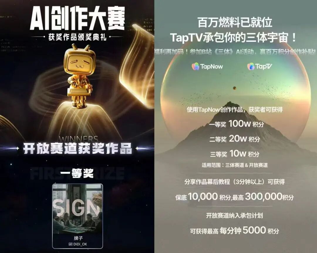 B站“AI创作大赛-开放赛道”官宣结果,由TapNow支持的AI短片《牌子》荣获一等奖,拿下100万元现金奖励,以及TapNow提供的100万积分。