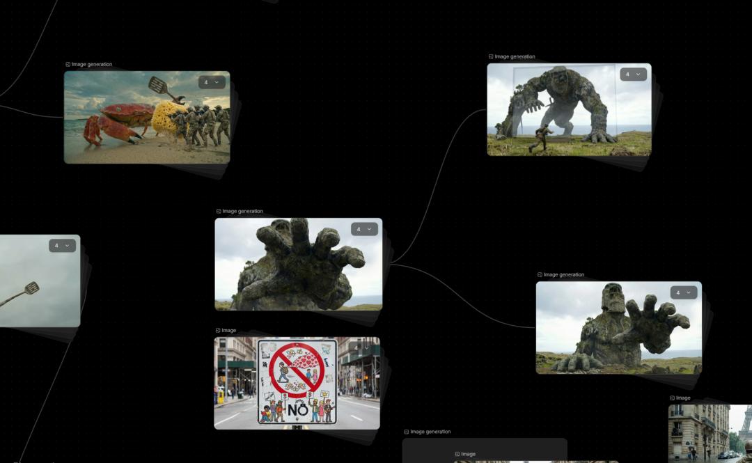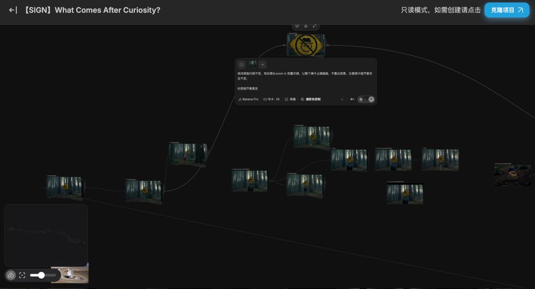 成片发布后,他也在TapNow公开了自己部分工作流和提示词。社区内对《牌子》感兴趣的AI超创们都可以一览他的线性画布,感受一个个奇妙镜头的诞生过程。