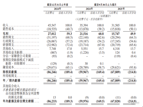 虽然诺令生物拥有着丰富的产品线,但就目前而言,公司的财务状况并不乐观。招股说明书显示,2024年-2025年1-9月(下称“报告期”),诺令生物分别实现营业收入4554.7万元、3156.5万元,年内利润分别为-8624.6万元、-6780.9万元,公司持续处于亏损状态,且亏损的金额比公司当期的营收还多。