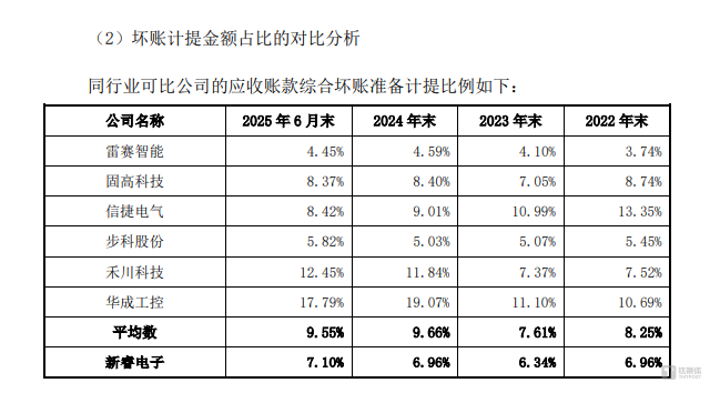 值得质疑的是,在应收账款占比高、逾期规模大、回款能力弱的多重风险下,公司坏账计提标准反而偏于保守。截至2023年末、2024年末、2025年6月末,新睿电子应收账款综合坏账准备计提比例分别为6.34%、6.96%、7.1%,同行可比公司平均值分别为7.61%、9.66%、9.55%,公司计提水平长期低于行业均值。这种回款风险高、坏账计提低的异常情况,进一步加大了利润真实性与资产减值风险的疑虑,亟待公司作出合理解释。