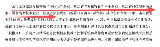 笔者注意到,新睿电子在申报稿中自述“公司是国家级专精特新“小巨人”企业、浙江省“专精特新”中小企业、浙江省科技型中小企业、国家高新技术企业,截至本招股说明书签署日取得58项专利,其中发明专利27项、实用新型专利16项、外观设计专利15项,并拥有计算机软件著作权140项,参与起草国家标准《工业系统、装置与设备以及工业产品信号代号第1部分:基本规则》和《机器状态监测与诊断预测第1部分:一般指南》。公司产品精准动态控制伺服机械手控制系统和高精度高灵活性多轴伺服机械手控制系”。
