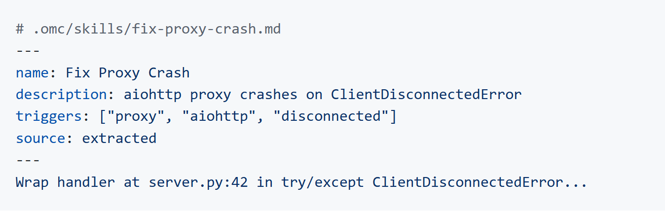 假设你在调试一个 aiohttp 代理崩溃的问题,折腾了两个小时终于找到了解决方案(在 server.py:42 加个 try/except)。OMC 会自动把这个经验提取出来,保存为一个「技能文件」: