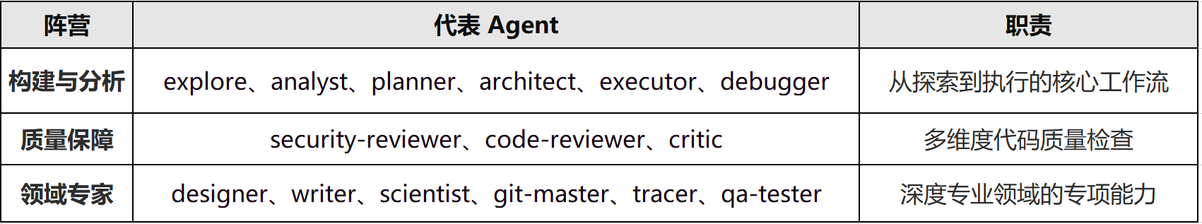 OMC 的 32 个 Agent 按职能分成三大阵营: