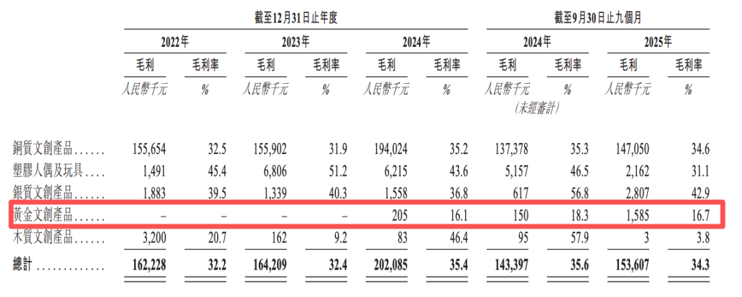 而截至2025年前三季度该部分业务的毛利率微增至16.7%,不仅低于塑料人偶玩具和银质文创产品,更是远低于铜质文创产品的34.6%,拉低了整体盈利水平。