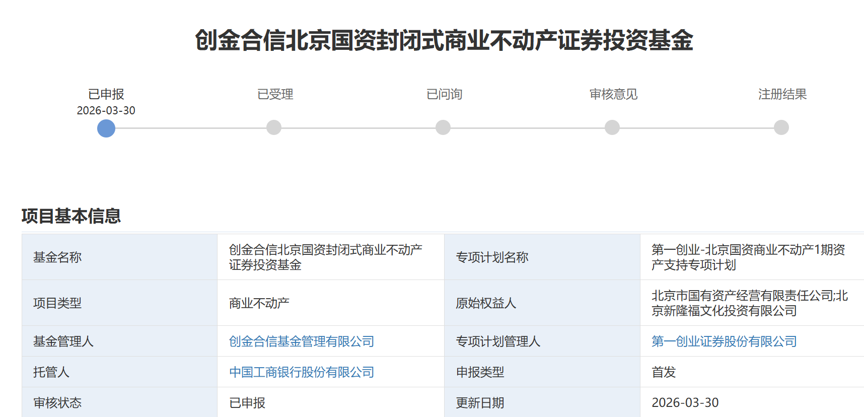 创金合信北京国资封闭式商业不动产证券投资基金的申报类型为“首发”。项目原始权益人之一北京新隆福文化投资有限公司,成立于2012年8月,由市属国企北京国资公司和东城区属国企北京东方文化资产经营公司按7:3出资比例共同出资成立,负责具体实施隆福寺地区风貌保护和城市更新项目。