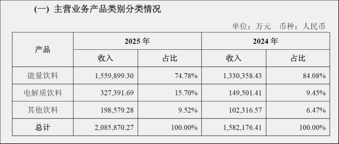 近年来,东鹏饮料推进“1+6”多品类发展战略,陆续推出无糖特饮、电解质水、气泡能量饮等新品。但收入结构仍高度集中,2025年能量饮料收入占比仍高达74.78%,电解质饮料、咖啡等赛道拥挤,虽有增长但对整体业绩贡献有限。