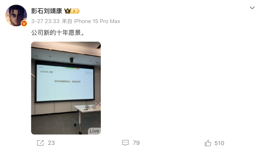 值得重点关注的是,影石 CEO 刘靖康在诉讼发生后一周事件内,就对外宣布更换公司「十年愿景」为:成为创造者的乐土,并启发世界。