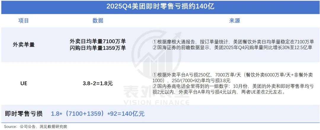 2025Q4,美团外卖+闪购日均订单为8459万单,紧随其后的对手为7000万单,后者单季亏损250亿元,可知单均亏损约为3.8元。而美团与其UE gap在2元左右,即单均亏损1.8元,可得单季亏损约为140亿元。