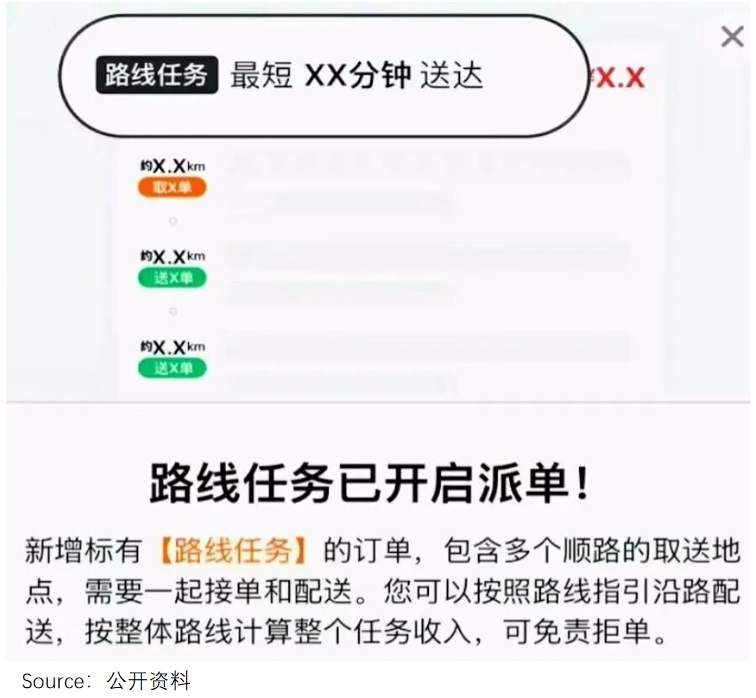 类似的设计调整,在派单与路线规划环节也没有缺席,以美团近期上新的“路线任务”为例,系统不再逐单派发,而是将同一路线、相近配送区域的多笔订单,打包派发给骑手,以优化路径、减少空跑。