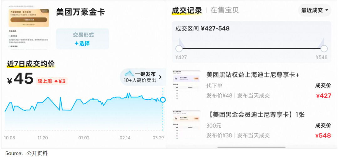 看看二手平台就明白了:许多人正在倒卖美团黑金“迪士尼尊享卡”“万豪金卡”权益,其中不乏溢价卖出的。