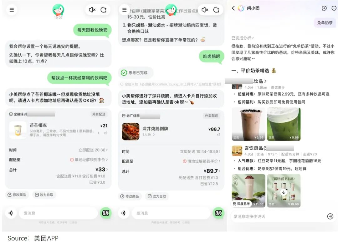 美团早已意识到AI的颠覆性,自研了LongCat系列大模型,上线了主打语音点外卖、找餐厅的“小美”APP,今年春节推出的AI管家“小团”还能一句指令全网比价、薅优惠券。