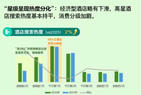 其他平台的数据也在证明着将要到来的这个小长假的热度。飞猪发布的《2026清明假期出游风向标》显示国内景区门票的预订张数同比增长了超70%;而携程的一份报告则通过酒店搜索热度展示出旅游消费逐渐分层的趋势。
