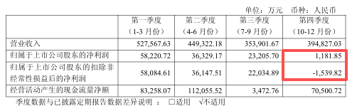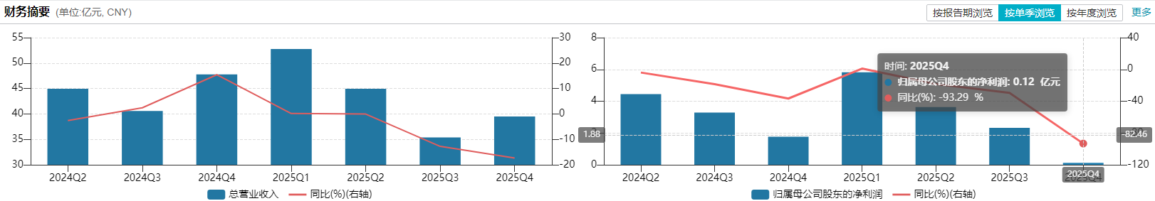 从季度数据来看,2025年一季度至三季度,公司归母净利润分别为5.82亿元、3.63亿元、2.32亿元,虽逐季下滑但维持盈利;进入四季度,归母净利润直接砸至1181.85万元,扣非归母净利润更是转亏,单季亏损近1540万元。