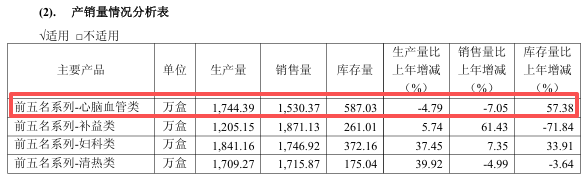 存货端的压力是减值计提的源头之一。截至2025年末,公司存货账面价值达106.17亿元,占总资产比例超34%,库存规模居高不下。其中,核心的心脑血管类产品库存同比激增57.38%,而销量同步下滑7.05%,产销严重失衡。
