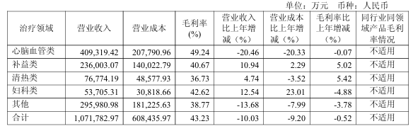 2025年,心脑血管类产品实现收入40.93亿元,同比下降20.46%;以安宫牛黄丸为代表的核心品种销量持续下滑,成为拖累整体营收的主要因素。尽管同期补益类、妇科类产品分别增长10.94%、12.54%,但受限于品类规模偏小,难以对冲心脑血管类产品大幅下滑带来的缺口。