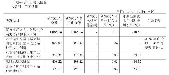而同仁堂长期重营销、轻研发,产品矩阵老化严重。2025年公司研发投入占营业收入比例仅2.27%,研发方向集中于复方小活络丸、愈风宁心滴丸等传统品种的工艺改进与上市后再评价,在创新中药、大健康新品等领域布局寥寥。