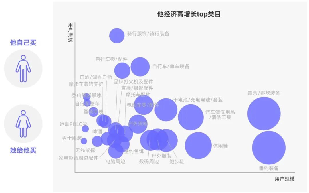 那些曾经舍不得购入兴趣装备,将有更大概率被收入囊中。2024年双11,骑行服饰/骑行装备、自行车/单车装备等户外骑行用品是“他经济”中用户增速最快的品类,露营/野炊装备、垂钓装备则是用户规模最大的品类。[7] 随着自身需求被放在最高优先级,不管骑行、露营还是垂钓,过去男性只能消费入门款,现在却能全款上顶配。