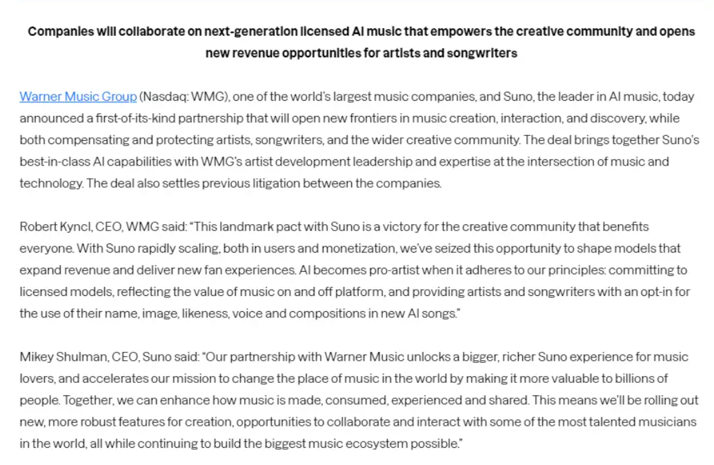 随后,和解陆续发生,2025年11月,Suno与华纳音乐完成和解并建立授权合作,Udio也先后与环球、华纳达成协议。这一系列和解所确立的方向是:AI平台须向版权方取得训练数据授权,版税分成与合规许可将成为AI音乐商业化的必要成本。