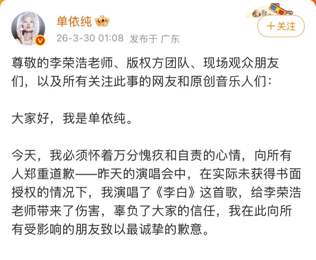 事情的经过大家应该都知道了。3月29日,李荣浩在微博上对单依纯发起控诉,称其在版权方明确拒绝的情况下,于深圳演唱会上侵权演唱了自己的代表作《李白》。随后,单依纯正式向李荣浩道歉,将问题归结于主办团队疏忽,表示之后会全面自查纠错;李荣浩随即也表示不会主动再提,事件就此告一段落。