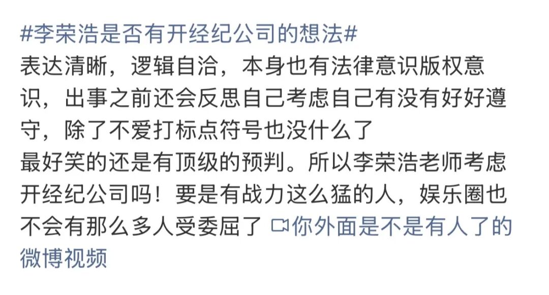 事件发生后,不仅#李荣浩 中译中#、#李荣浩今天不将就#、#李荣浩怼人战绩可查#等相关话题持续登上热搜,成为大众娱乐话题,更引发全网对“文艺工作者要有文化”的热议,甚至有博主调侃:“李老师表达清晰、逻辑自洽,又有法律意识,是否考虑开个经纪公司?”