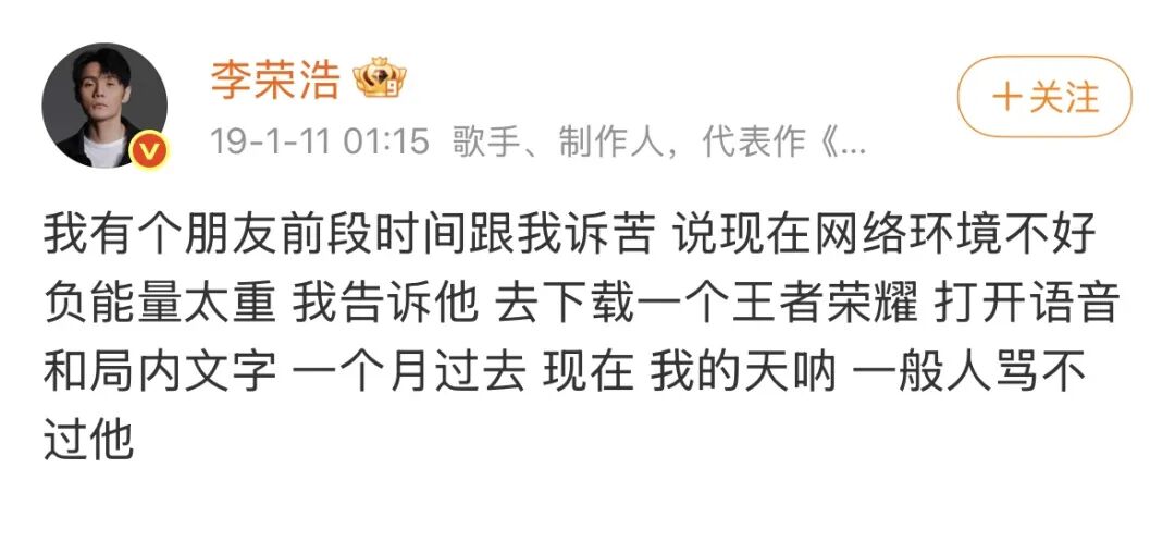 与此同时,随着话题的持续出圈,李荣浩早年间的不少经典言论也被考古,进一步丰富了“对线王者”的形象。例如,他曾在社交平台调侃,称朋友向他诉苦,现在的网络环境负能量太重,而他的建议是下载一个《王者荣耀》,结果朋友修炼归来,一般人骂过不过他。网友见状纷纷玩梗,笑称他自己的犀利言辞,想必也是在峡谷里“练出来的”。