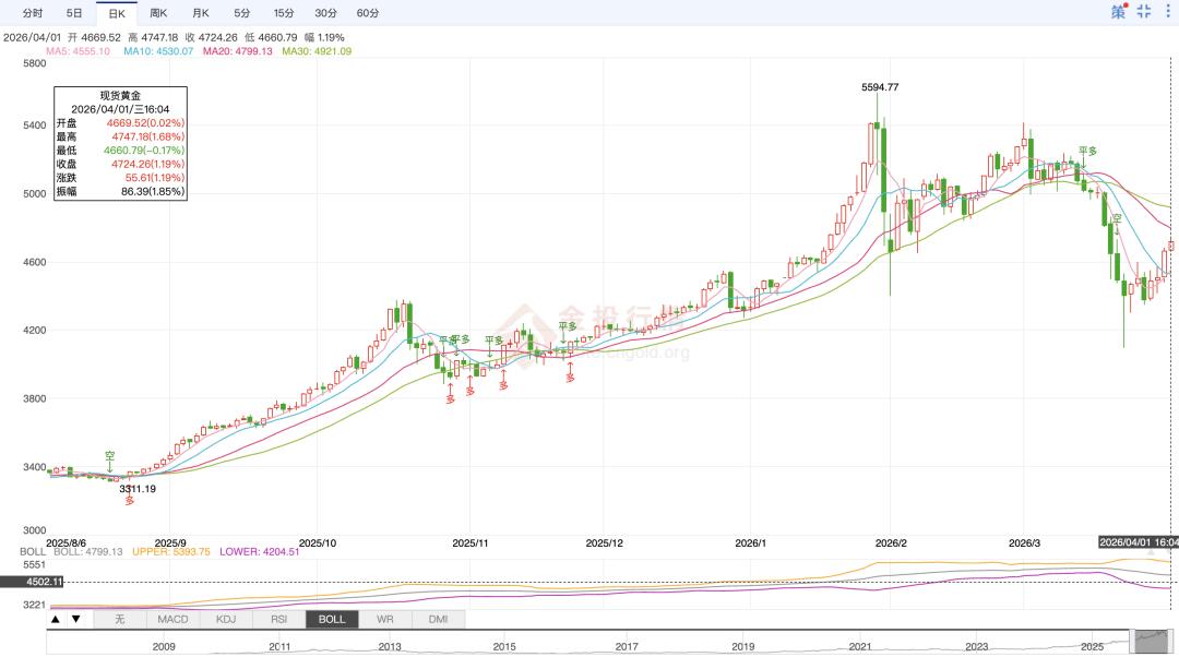 2026年,黄金市场上演了大起大落的“过山车”行情——伦敦黄金现货一度飙升到5598美元/盎司的高位,又在3月遭遇断崖式暴跌,单日最大跌幅超8%,最低探至约4099美元/盎司,已经累计回撤近30%。随后一度反弹,重回4500美元/盎司以上。