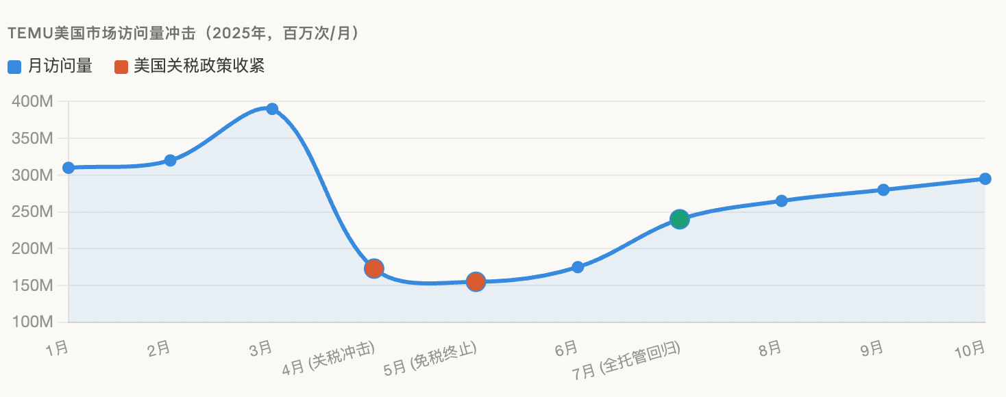 表面上看是关税。美国取消800美元以下包裹免税,空运直邮走不通,Temu网站访问量4月骤降55%;欧盟150欧元免税政策也将于2026年7月终止。这些政策变化的确伤到了Temu,但它们不是根本问题。