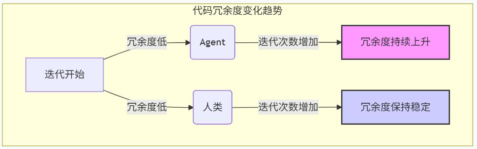 图表:Agent代码冗余度随迭代次数持续上升,而人类代码保持稳定。数据来源:SlopCodeBench,2026年3月。