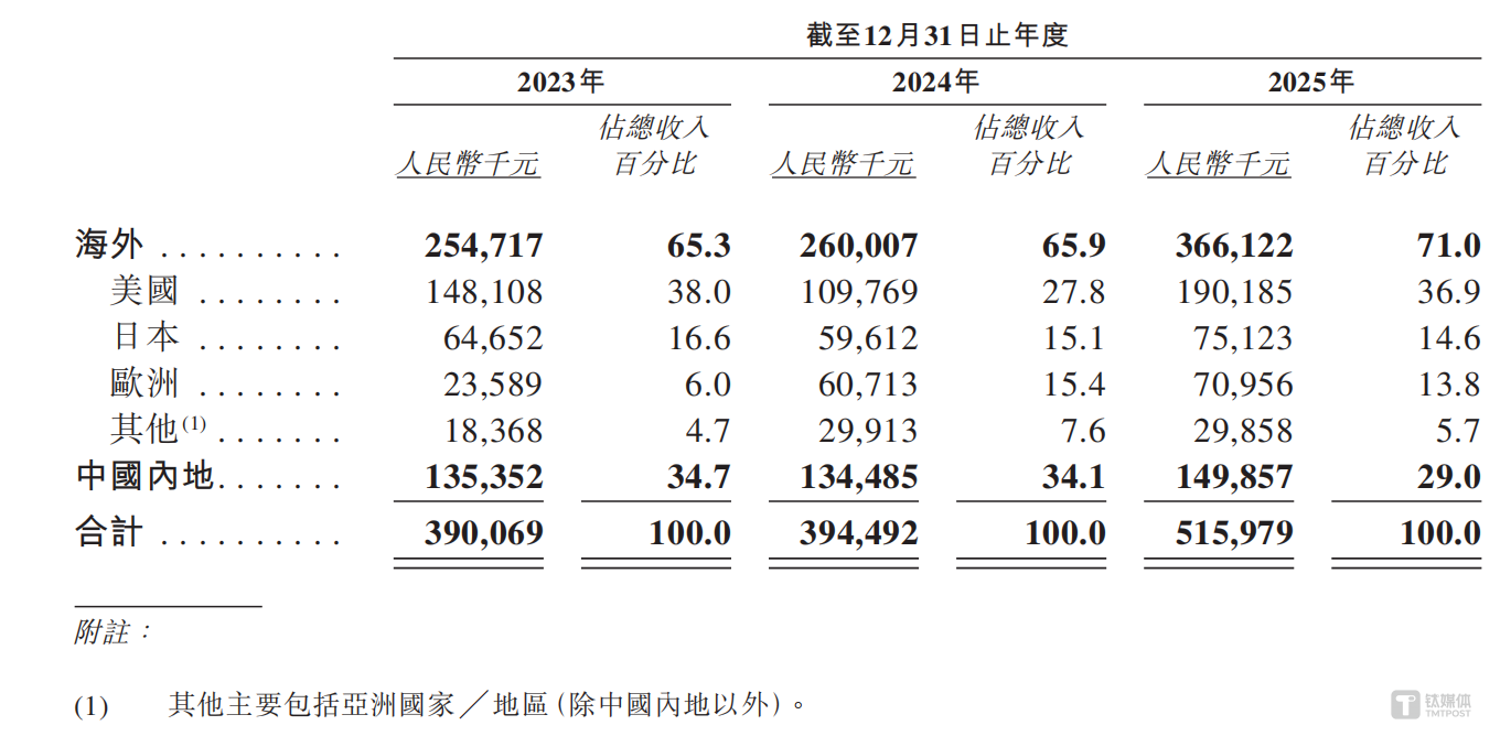 截至2025年12月31日,XREAL产品已进入中、美、日、韩、英、西、德等40个国家和地区,且在北美、日本及韩国均设有本地销售与运营团队。2025年,XREAL超70%的收入来自海外市场。