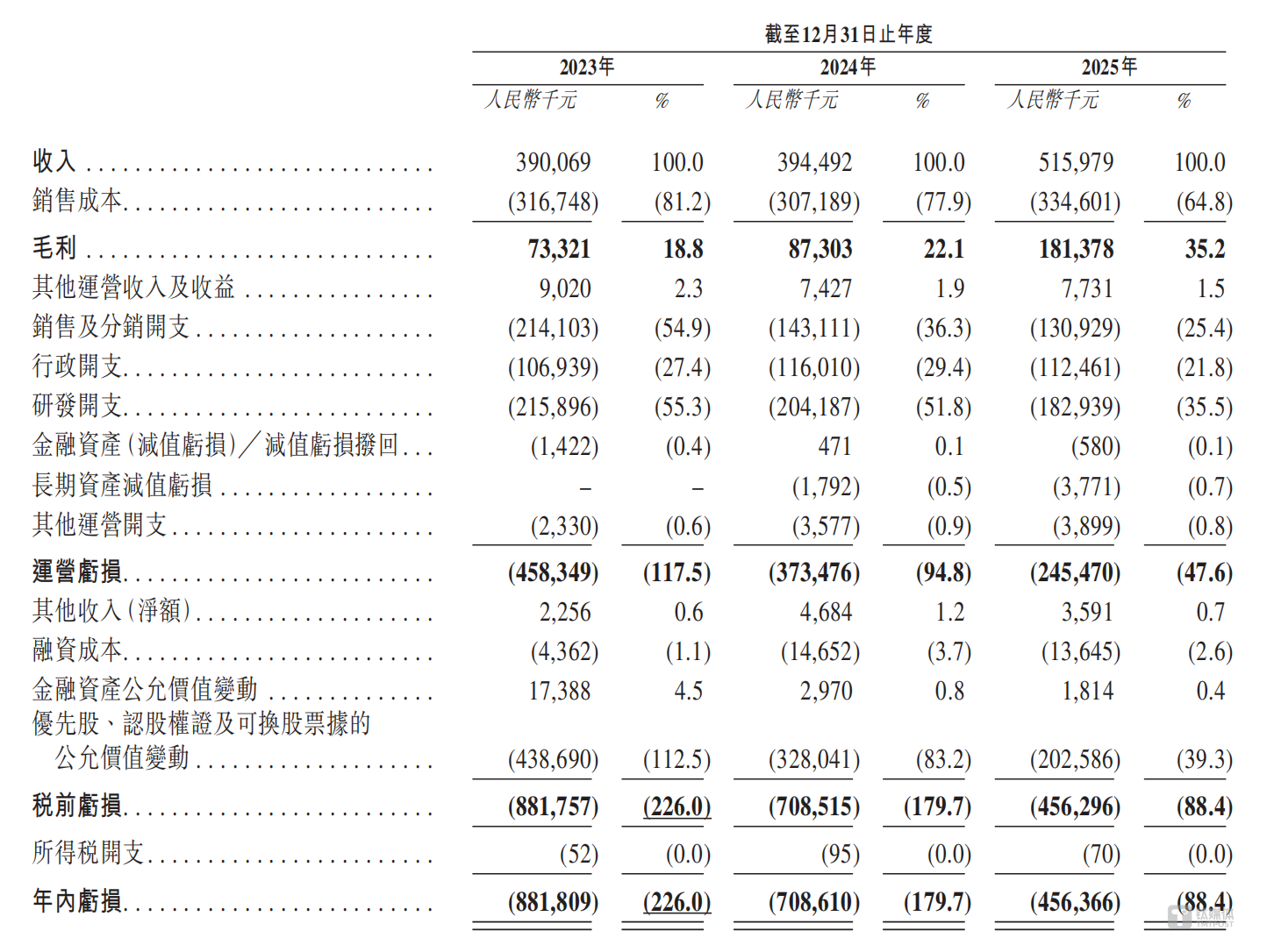 2023-2025年,XREAL分别实现营收3.90亿元、3.94亿元、5.16亿元,毛利率分别为18.8%、22.1%和35.2%,年内亏损分别约为8.82亿元、7.09亿元、4.56亿元。其中,2025年收入同比增长30.8%,AR眼镜销售收入4.03亿元,占总收入的78.1%。