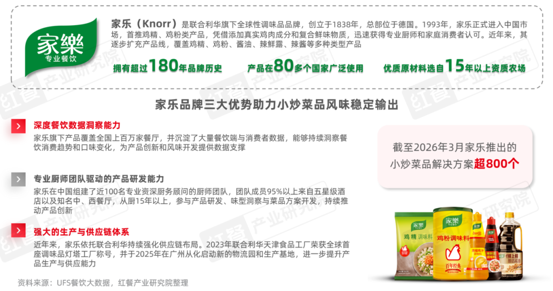 近年来,家乐依托深度餐饮数据洞察能力、专业厨师团队驱动的产品研发能力以及强大的生产与供应链体系,持续推动小炒赛道发展。截至2026年3月,家乐开发的小炒菜品解决方案超800个,覆盖川菜、湘菜、赣菜、滇菜等主要中餐菜系,为行业提供了高效可复制的产品。