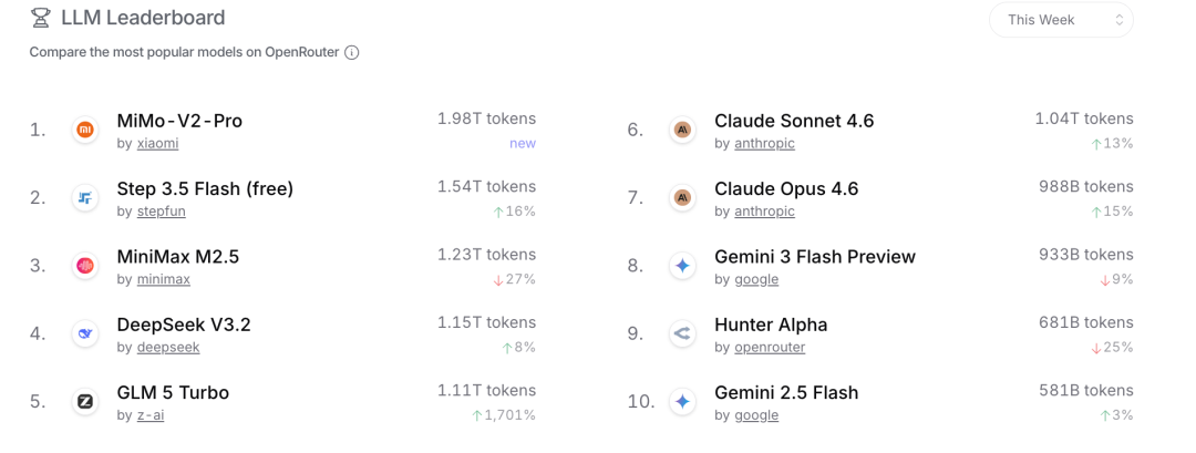 OpenRouter最新发布的数据显示,中国AI大模型在平台上的周调用量达到4.69万亿Token,连续第二周超越美国。而全球调用量排名前五均是国产模型。智谱的GLM 5 Turbo以 1.1万亿Token调用量位居第五。