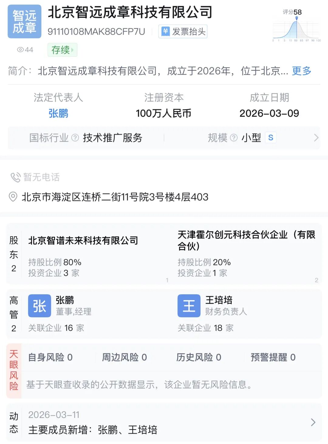 公开信息显示,“北京智远成章科技有限公司”“杭州智赋千行科技有限公司”分别成立于上个月9日和12日。表面上看,这是一次常规的工商注册,但解构其股权结构不难发现,这更接近一次组织层面的调整。