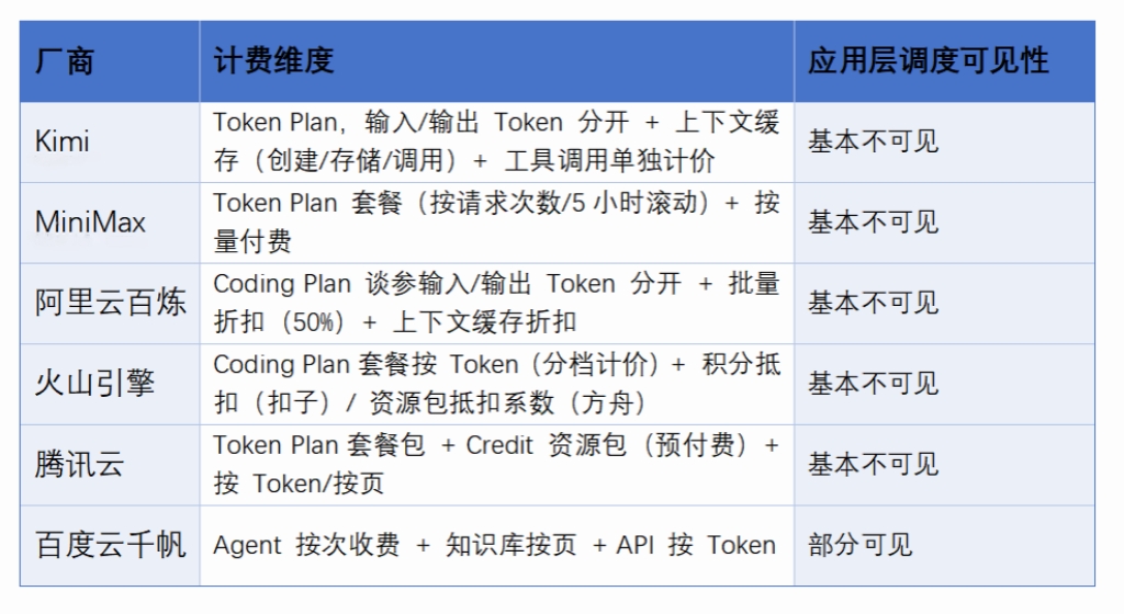 API 层透明适合开发者,应用层透明适合企业采购——当你需要向老板解释“为什么这个月 AI 花了 2 万块”时,“调用了 500 次深度研究 Agent”比“消耗了 100 万 token”更有说服力。而有意思的是,在这六家中,只有百度将 Agent 成本显性化,其他五家仍把 Harness 调度成本打包在 Token 中。