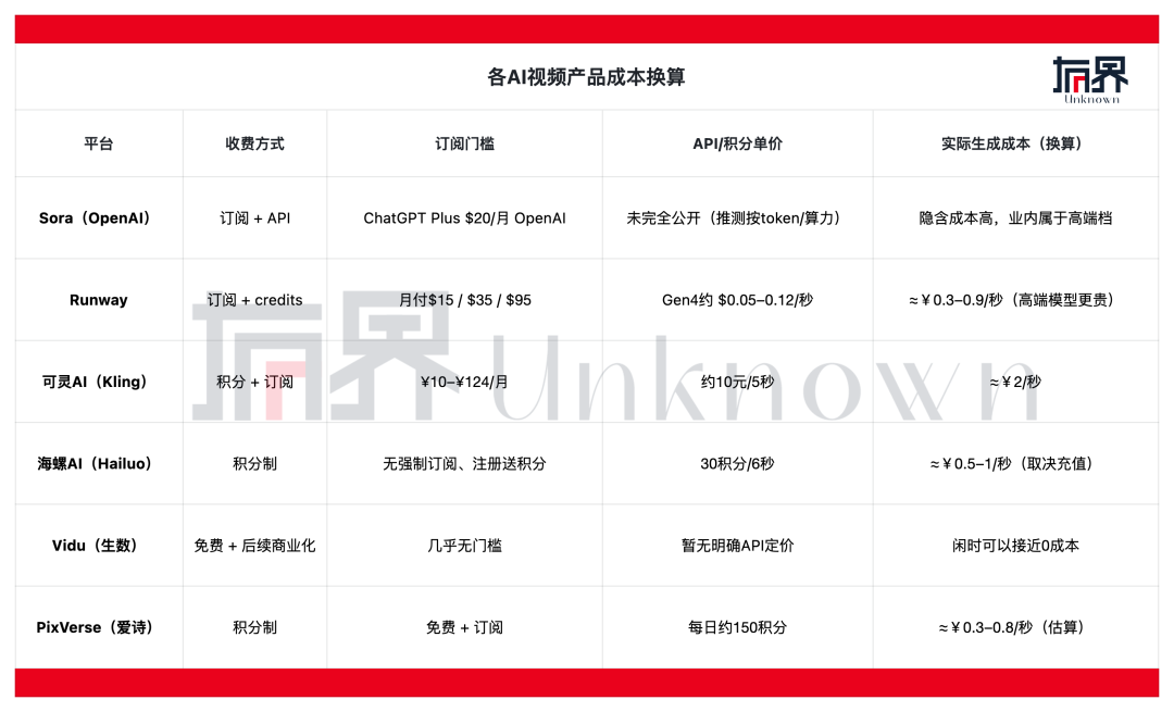 在目前主流视频生成模型中,Sora最低的订阅门槛也是20美金一个月,算得上是收费最贵的。如果Sora都“不经济”,其他模型是否也存在这种问题?