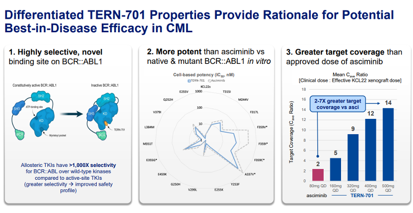 早期体外实验显示,TERN-701效力强于Asciminib,对野生型及突变型BCR::ABL1均有效,在携带T315I突变及复合突变的患者群体中展示出差异化的活性。