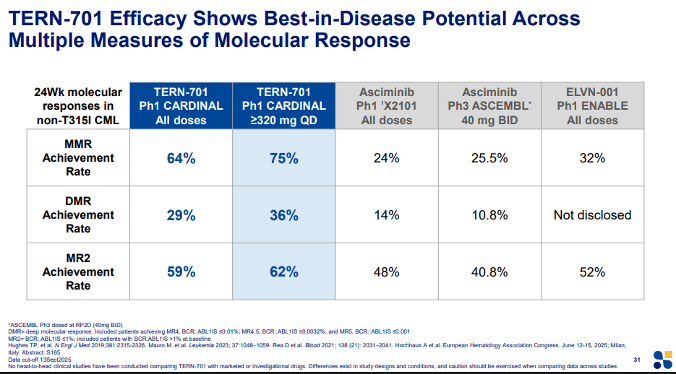 结构上TERN-701同样属于变构抑制剂,但在主要分子学缓解(MMR)、深度分子学缓解(DMR)两项治疗深度指标上表现更佳。