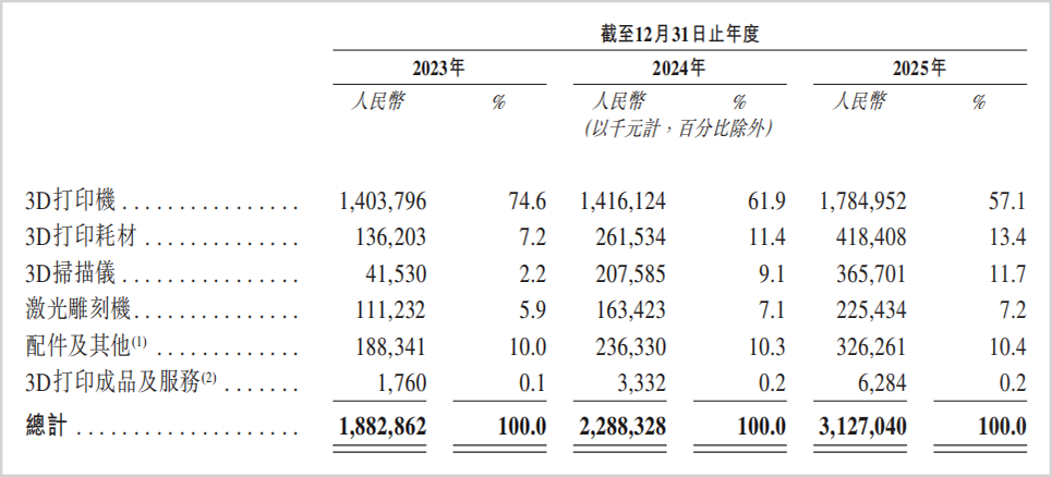 面对竞争,创想三维也在打造多元化业务,除了核心业务支柱3D打印机外,还扩展了耗材、3D扫描仪、激光雕刻机、配件等。2025年3D打印机的收入占比已降至57.1%,耗材、3D扫描仪增长较快,占比均提升到了10%以上。