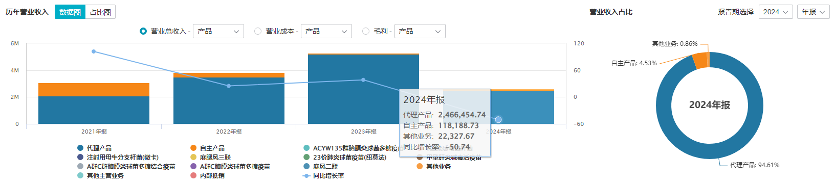 首先,业绩崩塌与大额减值,倒逼合作条款重构。智飞生物的业绩曲线,与默沙东代理业务高度绑定。2018年拿下九价HPV独家代理权后,公司营收从2017年的13.43亿元飙升至2023年的529.18亿元,2021年净利润突破百亿,成为A股疫苗“盈利王”。