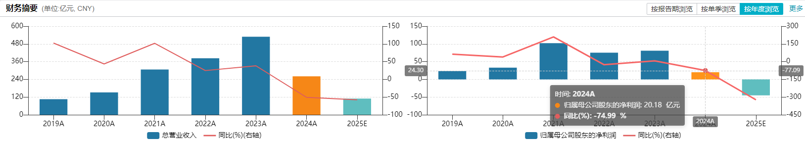 但2024年起急转直下,全年营收腰斩至260.7亿元,净利润骤降74.99%至20.18亿元;2025年直接陷入巨亏,亏损额远超2023-2024年净利润总和。